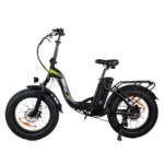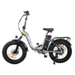 Full suspension fork, fat tyre, step through design, foldable, rear rack